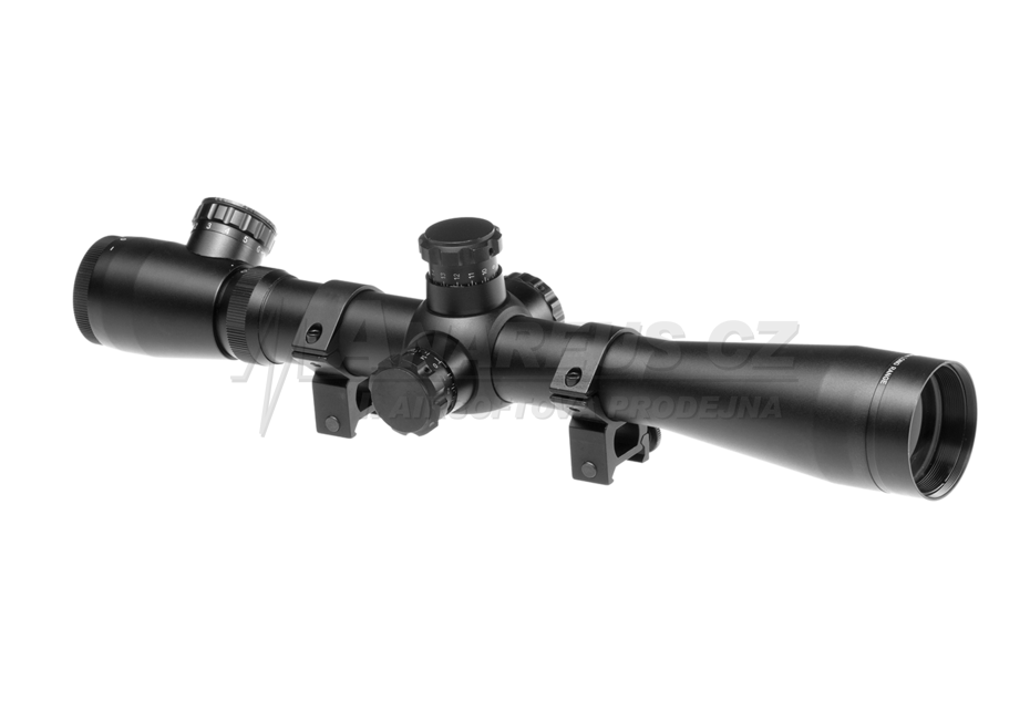 Optika přiblížením 3,5 – 10 x 40 s nasvícením kříže. Balení obsahuje montážní kroužky na RIS