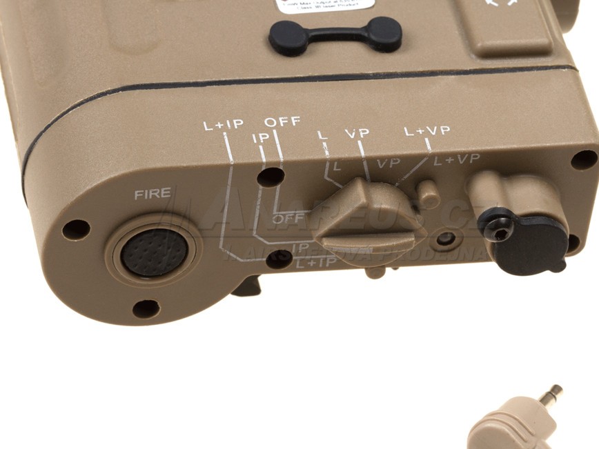 6 módů: Off, IR laser, viditelný laser, laser a světlo.