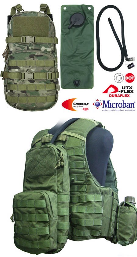 Balení obsahuje batoh a vak na vodu s obsahem 3l. Batoh se může připevnit i k taktické vestě pomocí MOLLE.