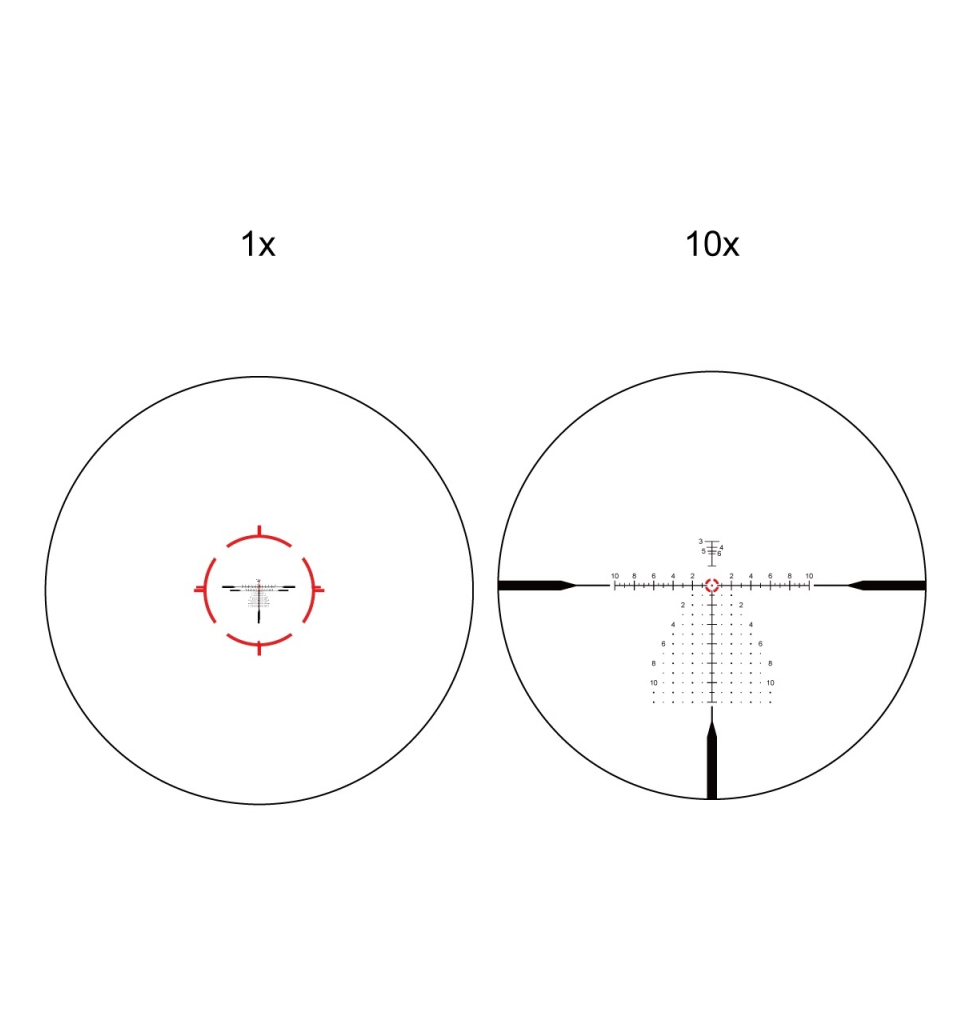 První fokální rovina (FFP)Záměrný kříž se mění podle zvětšení pro přesnější zaměřování.